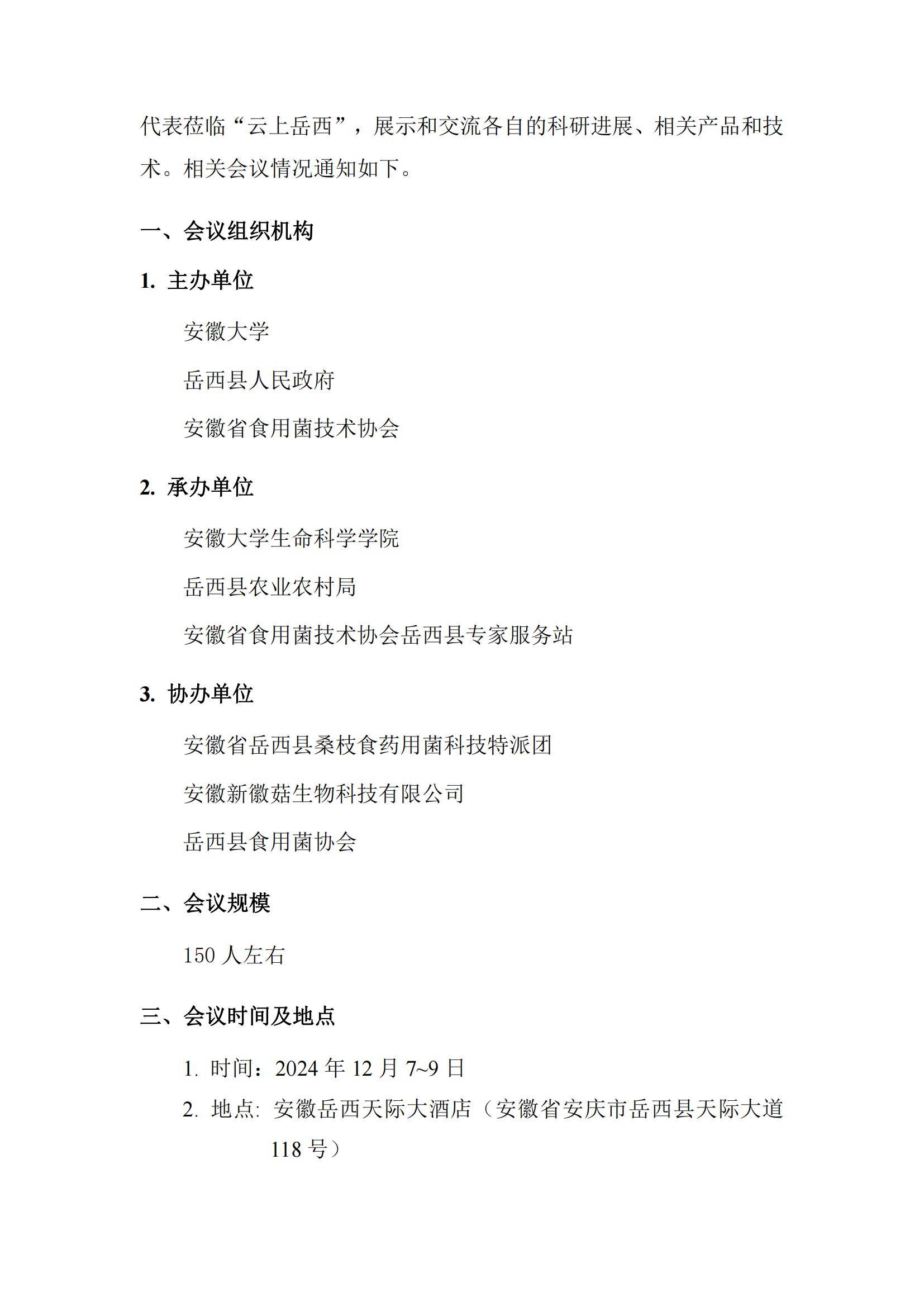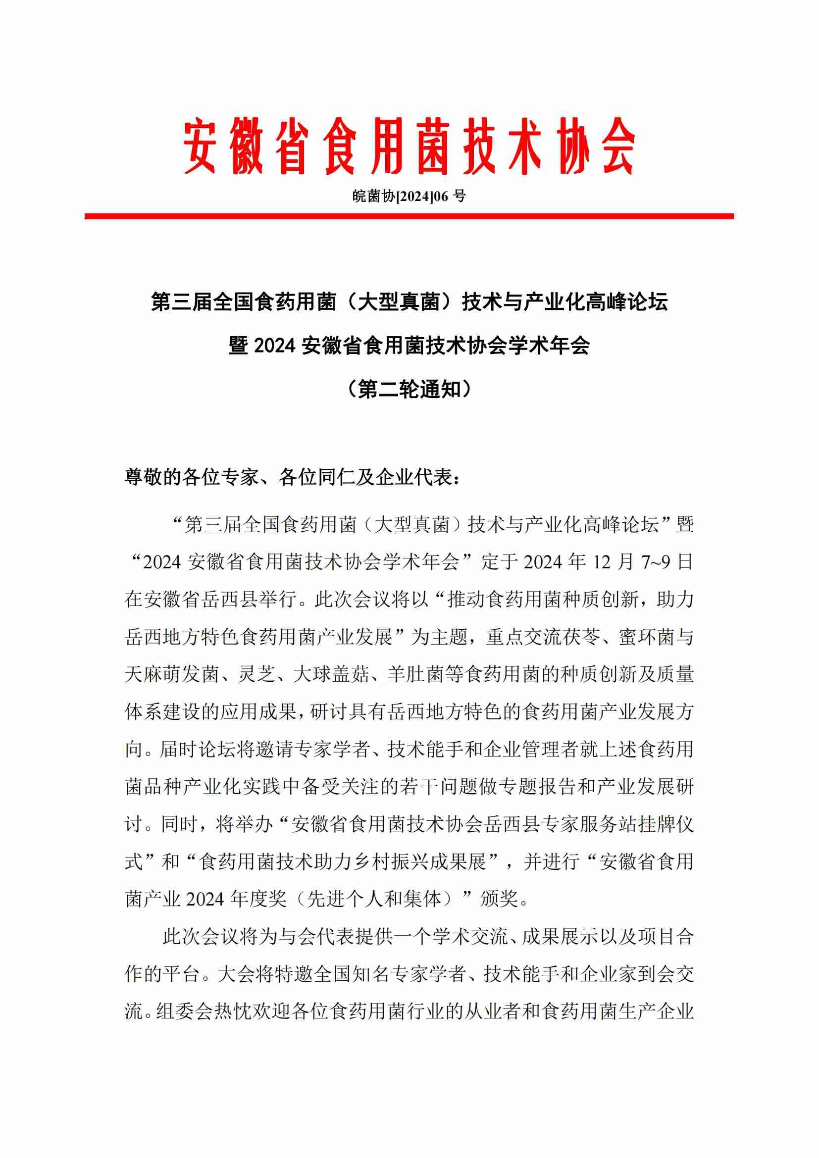 第三届全国食药用菌(大型真菌)技术与产业化高峰论坛 暨2024安徽省食用菌技术协会学术年会 (第二轮通知)